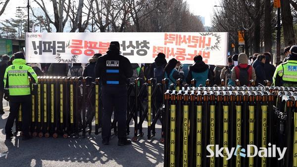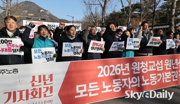 ¡ã ¾ç°æ¼ö ¹ÎÁÖ³ëÃÑ À§¿øÀåÀÌ 7ÀÏ ¼­¿ï Á¾·Î±¸ û¿Í´ë ¾Õ¿¡¼­ ¿­¸° '¿øÃ»±³¼· ¿ø³â ¼±Æ÷! ¸ðµç ³ëµ¿ÀÚÀÇ ³ëµ¿±âº»±Ç ÀïÃë!' 2026³â ¹ÎÁÖ³ëÃÑ ½Å³â ±âÀÚȸ°ß¿¡¼­ ¹ß¾ðÇϰí ÀÖ´Ù. ÀÌÀç¸í ´ëÅë·ÉÀÌ Ã»¿Í´ë·Î µ¹¾Æ¿À¸é¼­ ¿ë»ê ´ëÅë·É½Ç ÁÖº¯À¸·Î ¸ô·È´ø °¢Á¾ Áýȸ¡¤½ÃÀ§°¡ û¿Í´ë ÀαÙÀ¸·Î Àå¼Ò¸¦ ¿Å±â°í ÀÖ´Ù. °æÂûÀº û¿Í´ë »ç¶ûä ÀÏ´ë¿¡ ±âµ¿´ë 1°³ ºÎ´ë¸¦ »ó½Ã ¹èÄ¡Çϰí, Áýȸ »óȲ¿¡ µû¶ó ÀηÂÀ» Áõ¿øÇØ ´ëÀÀÇϰí ÀÖ´Ù. ÀÌÁ¾¿ø ±âÀÚ ¨Ï½ºÄ«À̵¥Àϸ®
