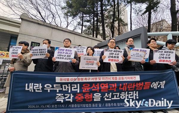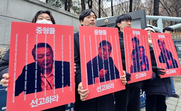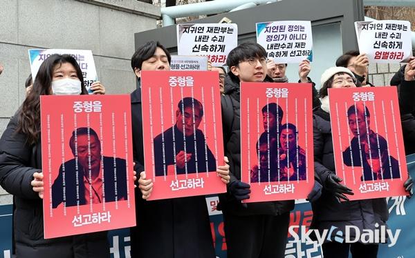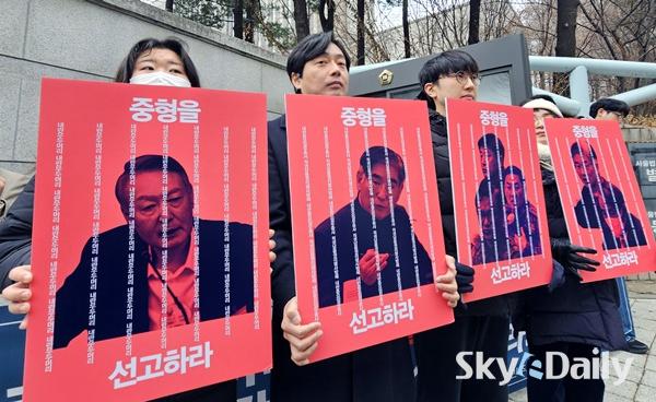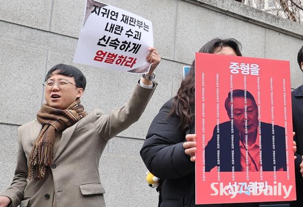 ¡ã Âü¿©¿¬´ë¿Í ¹ÎÁÖ»çȸ¸¦ À§ÇÑ º¯È£»ç¸ðÀÓ È¸¿øµéÀÌ 15ÀÏ ¿ÀÀü ¼­¿ï ¼­Ãʱ¸ ¼­¿ïÁß¾ÓÁö¹æ¹ý¿ø ¾Õ¿¡¼­ À±¼®¿­°ú ³»¶õ ÁÖ¿ä ÇǰíÀε鿡 ´ëÇØ ¹ý¿øÀÌ ÁßÇüÀ» ¼±°íÇÒ °ÍÀ» Ã˱¸Çϰí ÀÖ´Ù. Âü¼®ÀÚµéÀº 2¸¸¿© ¸íÀÌ ¼­¸íÇÑ Àǰ߼­¸¦ ¹ý¿ø¿¡ Á¦ÃâÇϸç À±¼®¿­ ³»¶õ ¿ìµÎ¸Ó¸® ÇøÀÇ »ç°ÇÀÇ ÀçÆÇºÎ(¼­¿ïÁß¾ÓÁö¹ý Çü»çÇÕÀÇ25ºÎ, ÀçÆÇÀå Áö±Í¿¬ ºÎÀåÆÇ»ç)¸¦ ÇâÇØ ¡°ÇåÁ¤Áú¼­¿Í ¹ÎÁÖÁÖÀÇ È¸º¹À» À§ÇØ ¹ýÁ¤ ÃÖ°íÇüÀ» ¼±°íÇØ¾ß ÇÑ´Ù¡±°í ÁÖÀåÇß´Ù. ÀÌÁ¾¿ø ±âÀÚ ¨Ï½ºÄ«À̵¥Àϸ®