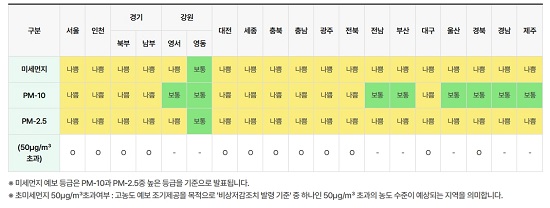 À̳¯ ¼öµµ±Ç¡¤°¿ø¿µ¼¡¤ÃæÃ»±Ç¡¤È£³²±Ç¡¤¿µ³²±Ç¡¤Á¦ÁÖ±ÇÀº '³ª»Ý', ±× ¹ÛÀÇ ±Ç¿ªÀº 'º¸Åë'À¸·Î ¿¹»óµÈ´Ù. ´Ù¸¸, ÃæºÏÀº ¿ÀÀü±îÁö '¸Å¿ì³ª»Ý'À¸·Î ¿¹»óµÇ¸ç, ´ëÀü¡¤¼¼Á¾¡¤±¤ÁÖ¡¤ÀüºÏÀº ¿ÀÀü¿¡ ÀϽÃÀûÀ¸·Î '¸Å¿ì³ª»Ý'À» º¸À̰ڴÙ.