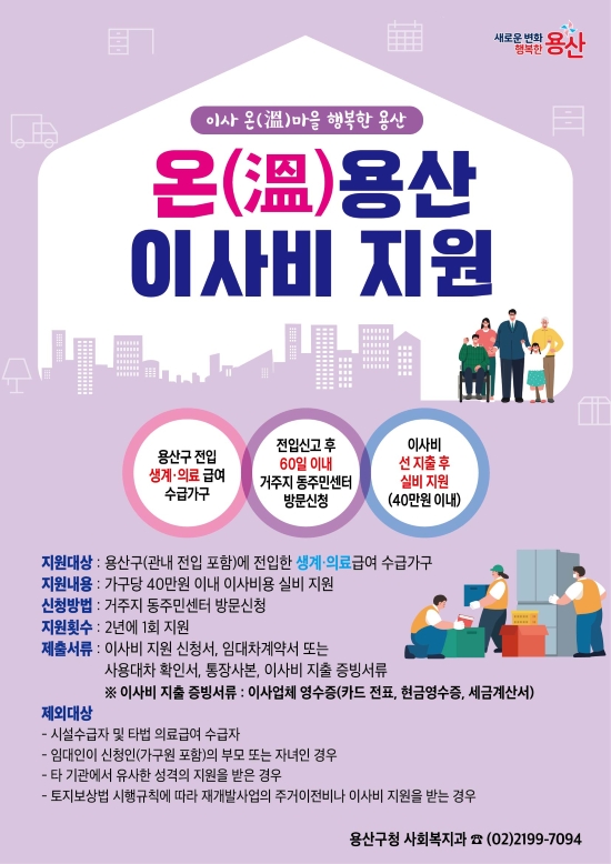 Áö¿ø ´ë»óÀº ¿ë»ê±¸·Î ÀüÀÔ(°ü³» ÀüÀÔ Æ÷ÇÔ)ÇÑ ±¹¹Î±âÃÊ»ýȰº¸Àå »ý°è¡¤ÀÇ·á±Þ¿© ¼ö±Þ°¡±¸·Î, ÀÌ»çºñ¸¦ ¼±ÁöÃâÇÑ µÚ ½ÅûÇÏ¸é °¡±¸´ç ÃÖ´ë 40¸¸ ¿ø ¹üÀ§ ³»¿¡¼ ½ÇÁ¦ ¼Ò¿äµÈ ÀÌ»çºñ¿ëÀ» Áö¿ø¹ÞÀ» ¼ö ÀÖ´Ù.