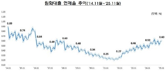 ±ÝÀ¶°¨µ¶¿øÀº ¡®2025³â 11¿ù ¸» ±¹³»ÀºÇà ¿øÈ´ëÃâ ¿¬Ã¼À² ÇöȲ¡¯À» °ø°³Çϸç 11¿ù ¸» ±âÁØ ±¹³»ÀºÇàÀÇ ¿øÈ´ëÃâ ¿¬Ã¼À²Àº 0.60%¶ó°í 28ÀÏ ¹àÇû´Ù. Àü¿ù ¸»(0.58%) ´ëºñ 0.02%p, Àü³â µ¿¿ù ¸»(0.52%) ´ëºñ 0.08%p »ó½ÂÇÑ ¼öÄ¡´Ù.