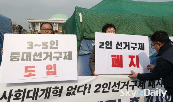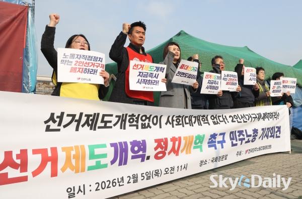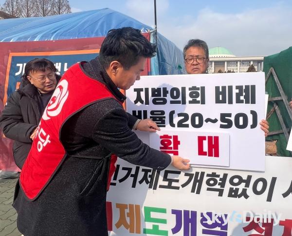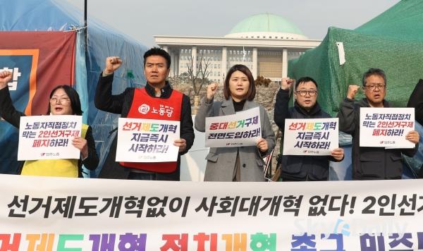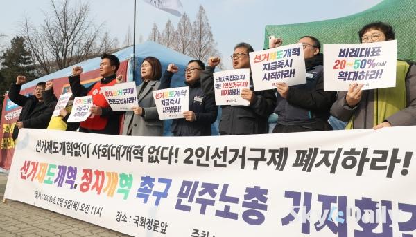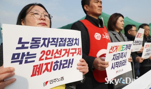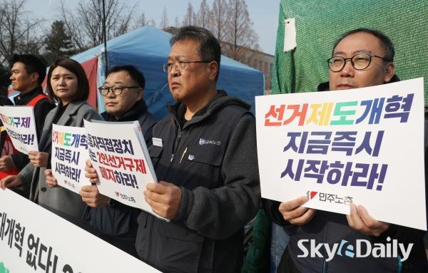 ¡ã ¹ÎÁÖ³ëÃÑÀÇ Á¶ÇÕ¿øµéÀÌ 5ÀÏ ¿ÀÀü ¼­¿ï ¿©Àǵµ ±¹È¸ ¾Õ¿¡¼­ ¡®¼±°ÅÁ¦µµ¡¤Á¤Ä¡°³Çõ Ã˱¸¡¯ °ü·Ã ±âÀÚȸ°ßÀ» ¿­°í ÀÖ´Ù. À̳¯ ±âÀÚȸ°ß¿¡¼­´Â ¡°ÇöÇà Áö¹æ¼±°Å Á¦µµ°¡ °Å´ë¾ç´ç Áß½ÉÀÇ ±¸Á¶¸¦ °íÂøÈ­ÇØ ³ëµ¿ÀÚ¡¤¼­¹Î¡¤»çȸÀû ¾àÀÚÀÇ Á¤Ä¡ Âü¿©¿Í ´ëÇ¥¼ºÀ» ½É°¢ÇÏ°Ô Á¦¾àÇϰí ÀÖ´Ù¡± ¸é¼­ ¡°±¹È¸ Á¤Ä¡°³ÇõƯº°À§¿øÈ¸°¡ Ã¥ÀÓ ÀÖ°Ô ¿ªÇÒÀ» ¼öÇàÇÒ °ÍÀ» °­·ÂÈ÷ Ã˱¸ÇÑ´Ù¡±°í ÁÖÀåÇß´Ù.  ¹Ú¹Ì³ª ±âÀÚ ¨Ï½ºÄ«À̵¥Àϸ®