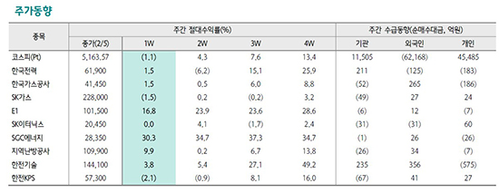 ÁÖ°¡ È帧Àº È®¿¬ÇÏ´Ù. SGC¿¡³ÊÁö´Â 5ÀÏ Á¾°¡ ±âÁØ 1ÁÖ ¼öÀÍ·üÀÌ 30.3%¿¡ ´ÞÇß°í, 4ÁÖ ´©Àû ¼öÀÍ·üµµ 34.7%¸¦ ±â·ÏÇß´Ù. ÇÑÀü±â¼úÀº 1ÁÖ ¼öÀÍ·ü 3.8%·Î Ãâ¹ßÇßÁö¸¸ 3ÁÖ 27.1%, 4ÁÖ 49.2%·Î »ó½Â ÆøÀ» Ű¿ü´Ù. ¼ö±Þ¿¡¼µµ Â÷À̰¡ µå·¯³µ´Ù. ÇÑÀü±â¼ú¿¡´Â ¿Ü±¹Àΰú ±â°ü ÀÚ±ÝÀÌ µ¿½Ã¿¡ À¯ÀԵǴ È帧ÀÌ ³ªÅ¸³µ°í, ´Ü±â ±Þµî ±¸°£¿¡¼ °³ÀÎÀº Â÷ÀÍ ½ÇÇö¿¡ ³ª¼´Â ¸ð½Àµµ ÇÔ²² ºñÃÆ´Ù.
