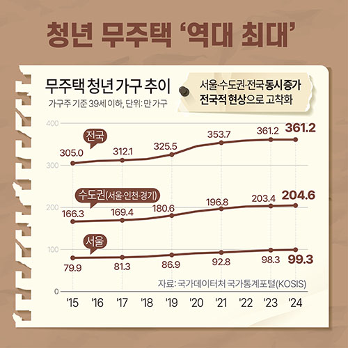 ¼¿ï¿¡ °ÅÁÖÇÏ´Â 20¡¤30´ë ¹«ÁÖÅà °¡±¸°¡ 100¸¸ °¡±¸¿¡ À°¹ÚÇÏ¸ç ¿ª´ë ÃÖ´ëÄ¡¸¦ ±â·ÏÇß´Ù. ±¹°¡Åë°èÆ÷Åп¡ µû¸£¸é 2025³â ±âÁØ ¼¿ïÀÇ 39¼¼ ÀÌÇÏ ¹«ÁÖÅà °¡±¸´Â 99¸¸¿© °¡±¸·Î, û³â ÁÖÅà ¼ÒÀ¯À²Àº 17.9%¿¡ ±×ÃÆ´Ù. ¼öµµ±Ç ¹«ÁÖÅà û³âµµ 200¸¸ ¸íÀ» ³Ñ¾î¼¹´Ù. ¼¿ï ¾ÆÆÄÆ® ÁßÀ§ °¡°ÝÀÌ 11¾ï ¿øÀ» µ¹ÆÄÇÑ µ¥´Ù ½Å±Ô ºÐ¾ç ¹°·®±îÁö ±Þ°¨Çϸé¼, ¼Òµæ Áõ°¡°¡ ´õµò û³âÃþÀÇ ³» Áý ¸¶·ÃÀº °¥¼ö·Ï ¾î·Á¿öÁö°í ÀÖ´Ù´Â ºÐ¼®ÀÌ ³ª¿Â´Ù.
