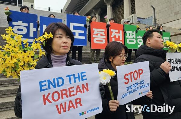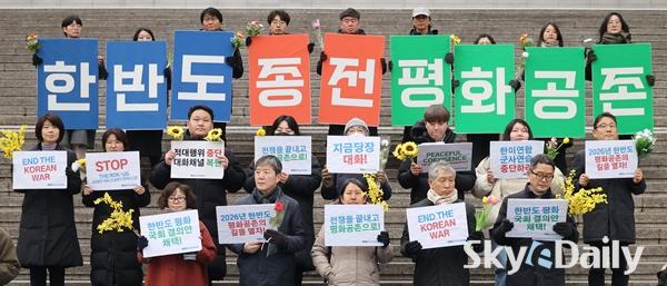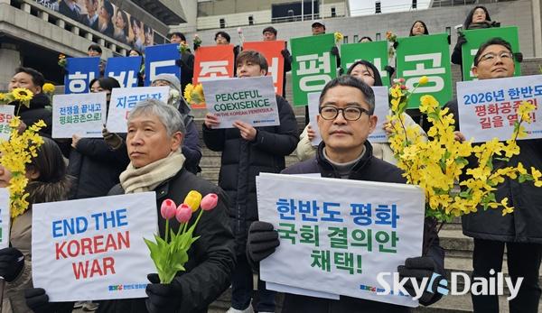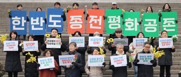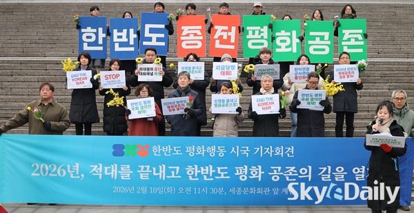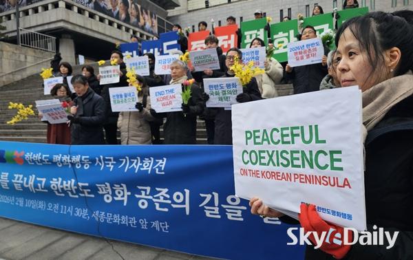 ¡ã Çѹݵµ ÆòÈÇൿ ȸ¿øµéÀÌ 10ÀÏ ¼¿ï Á¾·Î±¸ ¼¼Á¾¹®Èȸ°ü °è´Ü¿¡¼ '2026³â, Àû´ë¸¦ ³¡³»°í Çѹݵµ ÆòÈ °øÁ¸ÀÇ ±æÀ» ¿ÀÚ' Çà»ç¸¦ ÁøÇàÇϰí ÀÖ´Ù. Âü¼®ÀÚµéÀº Çѹݵµ ÆòÈ °øÁ¸ÀÇ Ãâ¹ßÁ¡Àº Àû´ë¿Í Çѱ¹ÀüÀï Á¾½ÄÀ̸ç,»óÈ£ ±º»çÀ§Çù Áß´Ü,»ó´ëüÁ¦ Á¸Áß¿¡ ±âÃÊÇÑ °ü°è°³¼±ÀÇ Çʿ伺À» °Á¶Çß´Ù. ÀÌÁ¾¿ø ±âÀÚ ¨Ï½ºÄ«À̵¥Àϸ®