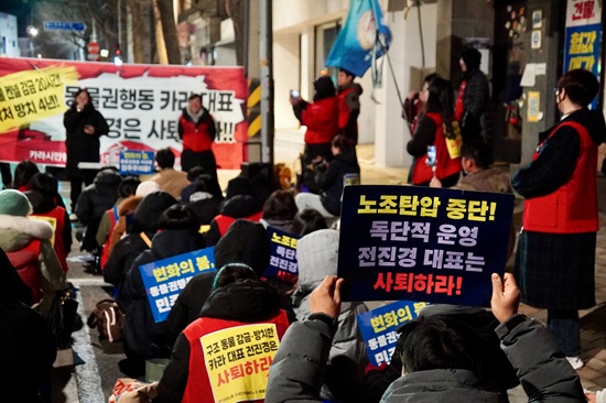 Áö³ 9ÀÏ ¼¿ï ¸¶Æ÷ ´õºÒ¾î¼û¼¾ÅÍ ¾Õ¿¡¼ ¿¸° ¡®µ¿¹°±ÇÇൿ Ä«¶ó(ÀÌÇÏ Ä«¶ó) ÀüÁø°æ ´ëÇ¥ »çÅð Ã˱¸ 11Â÷ ½Ã¹Î Áýȸ¡¯¿¡¼ Ãֹΰæ Àü±¹¹ÎÁÖÀϹݳëÁ¶ Ä«¶óÁöȸ(ÀÌÇÏ Ä«¶óÁöȸ) ±ä±Þ´ëÃ¥À§¿øÀåÀº °æ°ú º¸°í¸¦ ÅëÇØ ¡°ÀüÁø°æ ´ëÇ¥¿Í »çÃø °ü°èÀÚµéÀÇ °¢Á¾ ºÎ´ç³ëµ¿ÇàÀ§°¡ °í¿ë³ëµ¿ºÎ Á¶»ç °á°ú ±â¼Ò ÀǰßÀ¸·Î ¼¿ï¼ºÎÁö°Ë¿¡ ¼ÛÄ¡µÆ´Ù¡±°í ¹àÇû´Ù.