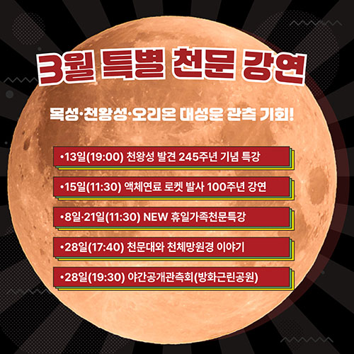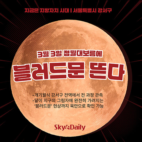 ¼¿ï °¼±¸°¡ Á¤¿ù´ëº¸¸§ÀÎ 3¿ù 3ÀÏ °³±â¿ù½Ä¿¡ ¸ÂÃç Æ¯º° õ¹® ÇÁ·Î±×·¥À» ¿î¿µÇÑ´Ù. °¼º°ºû¿ìÁÖ°úÇаüÀº õ¹® Ư°°ú üÇè Çà»ç, °ø°³°üÃøÈ¸¸¦ ¸¶·ÃÇØ ¡®ºí·¯µå¹®¡¯À» ½Ã¹Îµé°ú ÇÔ²² °üÃøÇÒ ¿¹Á¤ÀÌ´Ù. Çѱ¹Ãµ¹®¿¬±¸¿ø¿¡ µû¸£¸é À̳¯ ¿ÀÈÄ 6½Ã49ºÐ ºÎºÐ½ÄÀ» ½ÃÀÛÀ¸·Î 8½Ã4ºÐ °³±â½ÄÀÌ ÁøÇàµÈ´Ù. °úÇаüÀº º°ÀÚ¸® ÇØ¼³°ú ¿¡ÄÚ¹é ¸¸µé±â üÇèµµ ÇÔ²² ÁøÇàÇϸç, 3¿ù Áß Ãµ¿Õ¼º ¹ß°ß ±â³ä Ư° µî Ãß°¡ ÇÁ·Î±×·¥µµ ¼±º¸ÀδÙ.
