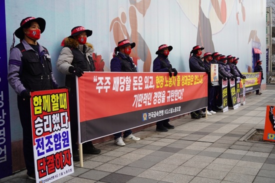KG½ºÆ¿³ëµ¿Á¶ÇÕ, KG½ºÆ¿ÀÎõ³ëµ¿Á¶ÇÕ, KG½ºÆ¿S&D³ëµ¿Á¶ÇÕ, ±Ý¼ÓÀϹݳ뵿Á¶ÇÕ KG½ºÆ¿S&IÁöºÎ µî 4°³ ¿¬ÇÕ³ëÁ¶´Â Áö³ 11ÀϺÎÅÍ 12ÀϱîÁö ¼¿ï Áß±¸ ¼ÒÀç KG±×·ì º»»ç ¾Õ¿¡¼ °øµ¿ ħ¹¬½ÃÀ§¸¦ Àü°³ÇÏ¸ç »çÃøÀÇ ÀüÇâÀûÀΠŵµ º¯È¸¦ Ã˱¸Çß´Ù.