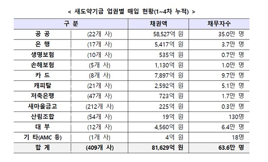 À̹ø 4Â÷ ¸ÅÀÔÀº ÃÑ 290°³ ±â°üÀÌ º¸À¯ÇÑ Ã¤±ÇÀ» Æ÷ÇÔÇß´Ù. ä±Ç¾× ±âÁØÀ¸·Î Áö¿ª½Å¿ëº¸ÁõÀç´Ü(16°³)ÀÌ 3042¾ï ¿ø(2¸¸4000¸í)À¸·Î °¡Àå Äǰí, ´ëºÎȸ»ç(5°³)°¡ 1112¾ï ¿ø(2¸¸¸í)À» Â÷ÁöÇß´Ù. »õ¸¶À»±Ý°í(212°³)´Â 225¾ï ¿ø(3000¸í), »ê¸²Á¶ÇÕ(54°³)Àº 19¾ï ¿ø(130¸í)ÀÌ´Ù. ÀºÇࡤº¸Çè»ç ´©¶ôä±Ç µî ±âŸ(3°³) 11¾ï ¿øµµ Æ÷ÇÔÇß´Ù.