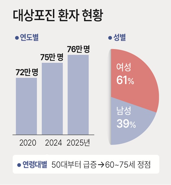 ´ë»óÆ÷ÁøÀº ¿¬·É Áõ°¡¿Í ÇÔ²² ¹ßº´ À§Çè°ú ÇÕº´Áõ ¹ß»ý·üÀÌ ³ô¾ÆÁö´Â ÁúȯÀÌ´Ù. Áö³ÇØ ±âÁØ ±¹³» 65¼¼ ÀÌ»ó Àα¸ ºñÀ²ÀÌ 20%¸¦ ³Ñ¾î¼¹´Ù´Â Á¡À» °¨¾ÈÇÏ¸é ´ë»óÆ÷Áø ȯÀÚ ±Ô¸ð´Â Àα¸ ±¸Á¶ º¯È¿¡ µû¶ó È®´ëµÉ °ÍÀ¸·Î ¿¹»óµÈ´Ù.