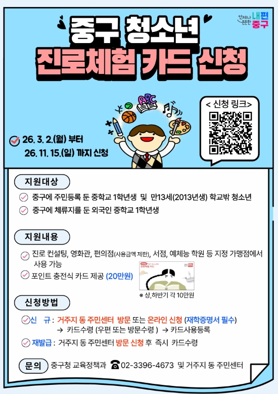 ¼¿ï½Ã Áß±¸°¡ Áö¿ª û¼Ò³âµéÀÇ ´Ù¾çÇÑ Áø·Î Ž»ö°ú ¹®È¡¤¿¹¼ú üÇè ±âȸ¸¦ È®´ëÇϱâ À§ÇØ ¡®Ã»¼Ò³â Áø·ÎüÇèÄ«µå¡¯¸¦ Áö±ÞÇÑ´Ù°í 5ÀÏ ¹àÇû´Ù.