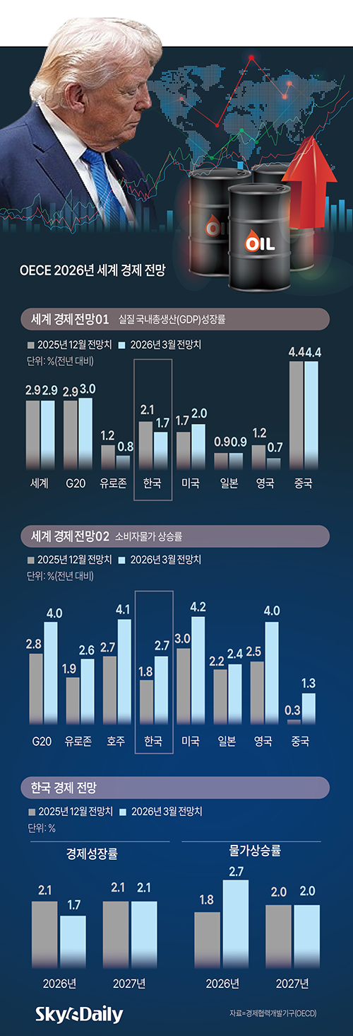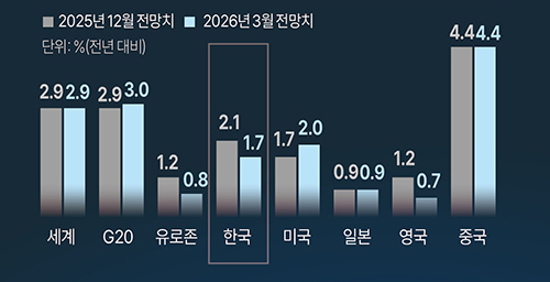 °æÁ¦Çù·Â°³¹ß±â±¸°¡ ¿ÃÇØ Çѱ¹ ¹°°¡»ó½Â·ü Àü¸ÁÄ¡¸¦ 1.8%¿¡¼ 2.7%·Î ´ëÆø »óÇâÇϰí, ¼ºÀå·üÀº 1.7%·Î 0.4%Æ÷ÀÎÆ® ³·Ãè´Ù. Áßµ¿ ÀüÀï ¿©ÆÄ·Î ¿¡³ÊÁö °¡°ÝÀÌ ¿À¸£¸ç ¹°°¡ »ó½Â ¾Ð·ÂÀÌ Ä¿Áø ¿µÇâÀÌ´Ù. Çѱ¹Àº ³ôÀº ¿¡³ÊÁö ¼öÀÔ ÀÇÁ¸µµ·Î ¼ºÀå Ÿ°ÝÀÌ ºÒ°¡ÇÇÇÑ ±¹°¡·Î Áö¸ñµÆ´Ù. ´Ù¸¸ ³»³â ¼ºÀå·üÀº 2.1%, ¹°°¡´Â 2.0%·Î ¾ÈÁ¤µÉ °ÍÀ¸·Î Àü¸ÁµÆ´Ù.