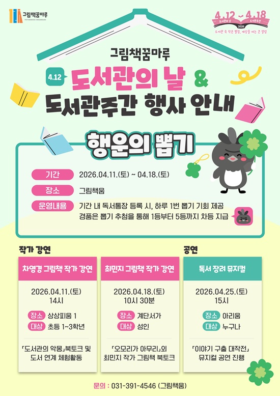 °æ±âµµ ±ºÆ÷½Ã ±×¸²Ã¥²Þ¸¶·ç°¡ ¡®µµ¼­°üÀÇ ³¯(4¿ù12ÀÏ)¡¯À» ¸Â¾Æ ÀÌ¿ëÀÚ ´©±¸³ª Âü¿©ÇÒ ¼ö ÀÖ´Â ´Ù¾çÇÑ ¹®È­ ÇÁ·Î±×·¥À» ¿î¿µÇÑ´Ù°í ¹àÇû´Ù.