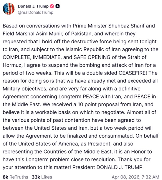Æ®·³ÇÁ ´ëÅë·ÉÀº 7ÀÏ ¿ÀÈÄ ¼Ò¼È¹Ìµð¾î Æ®·ç½º¼Ò¼ÈÀ» ÅëÇØ "À̶õÀÌ È£¸£¹«Áî ÇØÇùÀ» ¿ÏÀüÇϰí Áï°¢ÀûÀÌ¸ç ¾ÈÀüÇÏ°Ô °³¹æÇÏ´Â Á¶°ÇÀ¸·Î À̶õ¿¡ ´ëÇÑ Æø°Ý°ú °ø°ÝÀ» 2ÁÖ°£ Áß´ÜÇÏ´Â µ¥ µ¿ÀÇÇÑ´Ù"¸ç "À̰ÍÀº ¸ðµÎ¿¡°Ô Àû¿ëµÇ´Â ÈÞÀü(double sided ceasefire)"À̶ó°í ¹àÇû´Ù.