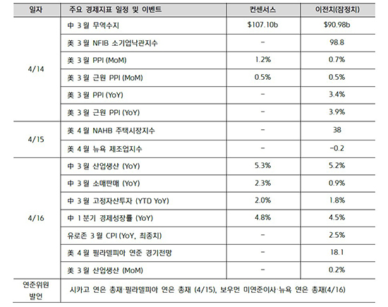 À̹ø ÁÖ ½ÃÀåÀÇ 1Â÷ °üÀü Æ÷ÀÎÆ®´Â ¹°°¡´Ù. 14ÀÏ ¹Ì±¹ 3¿ù PPI¿Í ±Ù¿ø PPI°¡ ¹ßÇ¥µÉ ¿¹Á¤Àε¥, ÃÖ±Ù À¯°¡ »ó½Â È帧ÀÌ »ý»êÀÚ¹°°¡¿¡ ¾ó¸¶³ª ¹Ý¿µµÆ´ÂÁö°¡ ÇÙ½ÉÀÌ´Ù. ¿©±â¿¡ Áß±¹ 3¿ù ¹«¿ªÁöÇ¥¿Í ÇÔ²² 1ºÐ±â ±¹³»ÃÑ»ý»ê(GDP)¡¤»ê¾÷»ý»ê¡¤¼Ò¸ÅÆÇ¸Å µîÀÌ °ø°³µÇ¸é¼ ±Û·Î¹ú ¼ö¿ä ȸº¹ ¿©ºÎµµ µ¿½Ã¿¡ ½ÃÇè´ë¿¡ ¿À¸¥´Ù. ¹°°¡¿Í °æ±â ÁöÇ¥°¡ ÇѲ¨¹ø¿¡ ¸Â¹°¸®´Â ¸¸Å °á°ú¿¡ µû¶ó ±Ý¸® ±â´ë¿Í À§ÇèÀÚ»ê ½É¸®°¡ µ¿½Ã¿¡ ¿òÁ÷ÀÏ °¡´É¼ºÀÌ Å©´Ù.