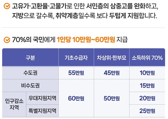 Áö±ÞÀº 1Â÷¿Í 2Â÷·Î ³ª´¶´Ù. 1Â÷ Áö±Þ ´ë»óÀº ±âÃÊ»ýȰ¼ö±ÞÀÚ, Â÷»óÀ§°èÃþ, ÇѺθð°¡Á·ÀÌ´Ù. ±âÃÊ»ýȰ¼ö±ÞÀÚ´Â 55¸¸¿ø, Â÷»óÀ§°èÃþ°ú ÇѺθð°¡Á·Àº 45¸¸¿øÀ» ¹Þ´Â´Ù. ºñ¼öµµ±Ç ¶Ç´Â Àα¸°¨¼ÒÁö¿ª °ÅÁÖÀÚ´Â 5¸¸¿øÀÌ Ãß°¡µÅ ÃÖ´ë 60¸¸¿ø±îÁö ¹ÞÀ» ¼ö ÀÖ´Ù.