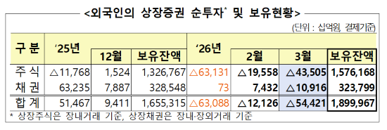 ±ÝÀ¶°¨µ¶¿øÀº À̰°Àº ³»¿ëÀ» ´ãÀº ¡®2026³â 3¿ù ¿Ü±¹ÀÎ Áõ±ÇÅõÀÚ µ¿Ç⡯À» 16ÀÏ °ø½ÃÇß´Ù. ÀÚ·á¿¡ µû¸£¸é Áö³´Þ ¿Ü±¹ÀÎÀº ±¹³» »óÀåÁÖ½Ä 43Á¶5050¾ï ¿øÀ» ¼ø¸ÅµµÇÏ°í »óÀåä±Ç 10Á¶ 9160¾ïÀ» ¼øÈ¸¼öÇß´Ù. ÃÑ 54Á¶4210¾ï ¿ø¿¡ ´ÞÇÏ´Â ÀÚ±ÝÀÌ ºüÁ®³ª°¡¸é¼ ¿Ã ÃʺÎÅÍ ½ÃÀÛµÈ ¿Ü±¹ÀÎÀÇ ÁֽĽÃÀå ¡®¿¢¼Ò´õ½º¡¯ ±â·ùµµ 3°³¿ù° Áö¼ÓµÇ´Â ¾ç»óÀÌ´Ù.