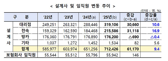 ±ÝÀ¶°¨µ¶¿øÀÌ 29ÀÏ ¹ßÇ¥ÇÑ ¡®2025³â º¸Çèȸ»ç ÆÇ¸Åä³Î ¿µ¾÷È¿À² ¹× °¨µ¶¹æÇ⡯¿¡ µû¸£¸é Áö³ÇØ ¸» º¸Çè¼³°è»ç´Â 71¸¸2426¸íÀ¸·Î Àü³âº¸´Ù 6¸¸1170¸í ´Ã¾ú´Ù. Áõ°¡À²Àº 9.4%´Ù.