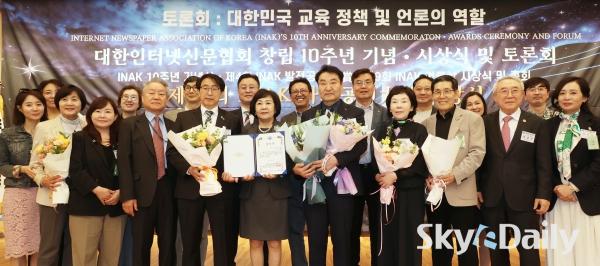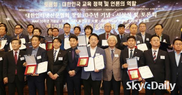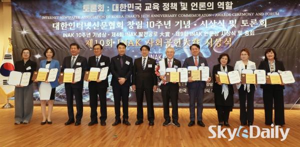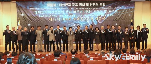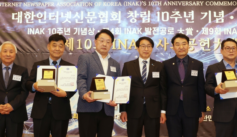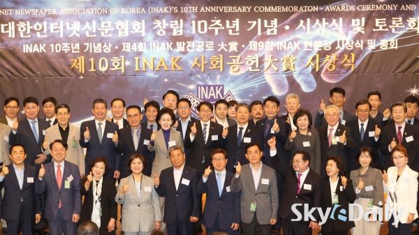 ¡ã (»ç)´ëÇÑÀÎÅͳݽŹ®Çùȸ(½Å¹®Çù) ⸳ 10Áֳ⠱â³ä½ÄÀÌ 29ÀÏ ¿ÀÈÄ ¼¿ï ¿©Àǵµ ±¹È¸µµ¼°ü ´ë°´ç¿¡¼ ¿·Á ¼ö»óÀÚµéÀÌ ±â³ä»çÁøÀ» Âï°í ÀÖ´Ù. À̳¯ ÇÔ²² ¿¸° ¡®Á¦10ȸ INAK »çȸ°øÇå ´ë»ó ½Ã»ó½Ä¡¯¿¡¼± ¹Î°æµÎ(¿ÞÂÊ ¼¼ ¹øÂ°) º»Áö ¹ßÇàÀÎÀÌ Á¦9ȸ ¾ð·Ð»ó°ú 10Áֳ⠱â³ä»óÀ» ¼ö»óÇß´Ù. 2016³â¿¡ Á¦Á¤µÈ INAK ¾ð·Ð»óÀº ¾ð·ÐÀÇ ¹ÎÁÖÈ ¹× ½Å¹®Çù ¹ßÀü¿¡ ±â¿©ÇÑ È¸¿ø»ç¿Í ¼Ò¼Ó ±âÀÚµéÀ» ´ë»óÀ¸·Î ½Ã»óÇØ ¿À°í ÀÖ´Ù. ¹Ú¹Ì³ª ±âÀÚ ¨Ï½ºÄ«À̵¥Àϸ®
