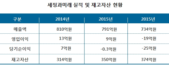 ±Ý°¨¿ø ÀüÀÚ°ø½Ã¿¡ µû¸£¸é ¼¼Á¤°ú¹Ì·¡ÀÇ ÃÖ±Ù 3³â°£ ¸ÅÃâÀº ÁÙ¾îµé°í ÀÖ´Â Ãß¼¼´Ù. 2013³â ¸ÅÃâ¾× 810¾ï¿ø¿¡¼ 2014³â 791¾ï¿ø, 2015³â 734¾ïÀ¸·Î °¨¼ÒÇß´Ù. ´õºÒ¾î 2013³â¿¡´Â 13¾ï¿ø, 2014³â 7¾ï¿øÀÇ ¿µ¾÷ÀÌÀÍÀ» ³ÂÁö¸¸ 2015³â¿¡´Â 19¾ï¿øÀÇ ¿µ¾÷¼Õ½ÇÀ» ±â·ÏÇß´Ù.