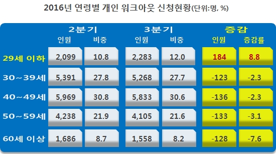 Áö³ ´Þ 21ÀÏ ¹ßÇ¥µÈ ½Å¿ëȸº¹À§¿øÈ¸ÀÇ ¡®2016³â 3ºÐ±â ½Å¿ëȸº¹½ÇÀû¡¯¿¡ µû¸£¸é Àü ¿¬·É´ë Áß °³ÀοöÅ©¾Æ¿ô(¿¬Ã¼±â°£ 3°³¿ù ÀÌ»óÀÇ Ã¤¹«¸¦ ´ë»óÀ¸·Î ¿ø±ÝÀ» ÁÙ¿©ÁÖ´Â Á¦µµ) ½ÅûÀÚ°¡ Áõ°¡ÇÑ ¿¬·É´ë´Â 20´ë°¡ À¯ÀÏÇÏ´Ù. Àüü ¿öÅ©¾Æ¿ô½ÅûÀÚ´Â 1¸¸9047¸íÀ¸·Î Áö³ ºÐ±â ´ëºñ 1.7% °¨¼ÒÇßÁö¸¸ 20´ë´Â ¿ÀÈ÷·Á 8.8% Áõ°¡Çß´Ù.