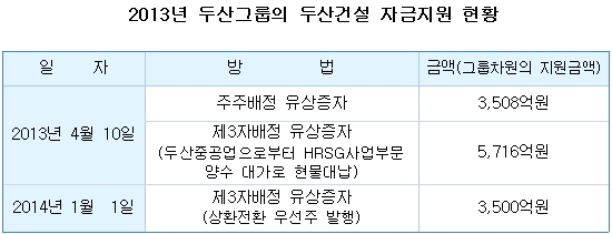 ´çÃÊ A-¿´´ø µÎ»ê°Ç¼³ÀÇ ½Å¿ëµî±ÞÀº 2012³â 6¿ù BBB+·Î Ç϶ôÇÑ ÈÄ Áö±Ý±îÁö ¿À°í ÀÖ´Ù. ÀÌ¿¡ µÎ»ê±×·ì Â÷¿ø¿¡¼ ÁÖÁÖ¹èÁ¤ ¹× Á¦3ÀÚ¹èÁ¤ À¯»óÁõÀÚ µîÀ» ÅëÇØ 1Á¶¿øÀÌ ³Ñ´Â ÀڱݼöÇ÷ÀÌ ÀÌ·ïÁö±âµµ Çß´Ù.