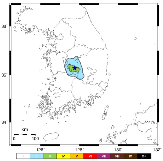 ±â»óû¿¡ µû¸£¸é Áø¾ÓÀº ºÏÀ§ 36.28µµ¡¤µ¿°æ 127.76µµÀ̸ç ÁöÁø ¹ß»ý ±íÀÌ´Â 9§°´Ù. ÃæºÏ°ú Àα٠Áö¿ªÀ» Áß½ÉÀ¸·Î ÁöÁøµ¿ÀÌ °¨ÁöµÆÀ» °ÍÀ¸·Î º¸ÀδÙ.