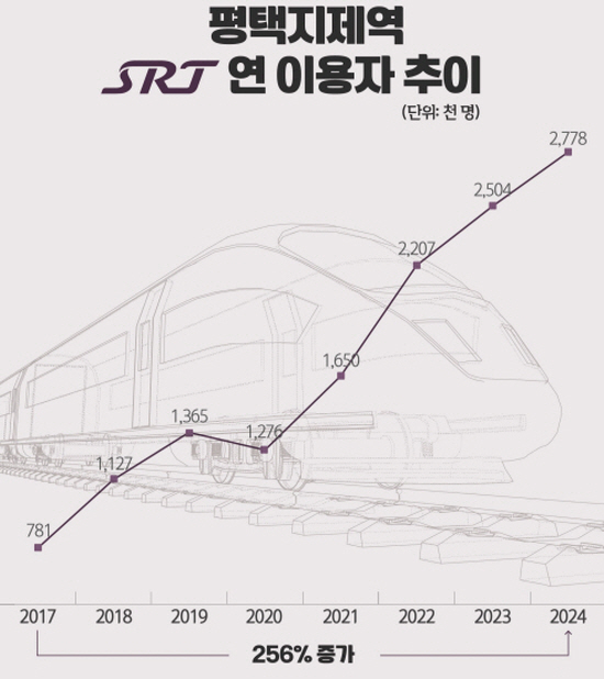 ÆòÅÃÁöÁ¦¿ªÀº 2016³â °³Åë ´ç½ÃºÎÅÍ SRT°¡ Á¤Â÷ÇÑ ¿ª»ç·Î ¸Å³â À̿밴 ¼ö°¡ ²ÙÁØÈ÷ Áõ°¡Çϰí ÀÖ´Ù. ½ÇÁ¦ ¡®Ã¶µµ¿¬°¨¡¯¿¡ µû¸£¸é ÆòÅÃÁöÁ¦¿ªÀÇ ¿¬°£ SRT ½ÂÇÏÂ÷ ÀοøÀº 2017³â 78¸¸1000¸íÀ̾úÁö¸¸ 2024³â¿¡´Â 277¸¸8000¸íÀ¸·Î 256%ÀÇ Áõ°¡À²À» ±â·ÏÇß´Ù. ÀÌ·¯ÇÑ Áõ°¡À²Àº SRT ¿ª»ç Áß °¡Àå ³ôÀº ¼öÄ¡´Ù.