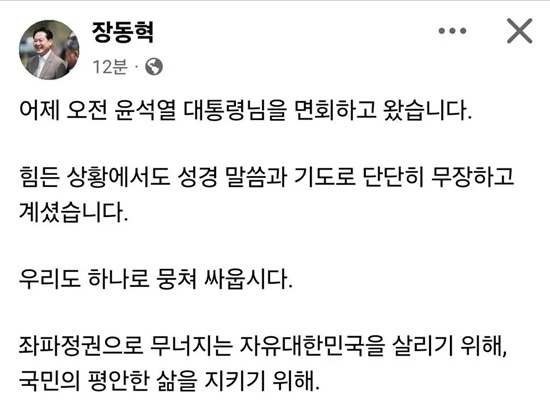 19ÀÏ Á¤Ä¡±Ç¿¡ µû¸£¸é Àå ´ëÇ¥´Â Áö³ 17ÀÏ ¿ÀÀü 11½ÃÂë °æ±âµµ Àǿսà ¼¿ï±¸Ä¡¼Ò¸¦ ã¾Æ ±è¹Î¼ö ÃÖ°íÀ§¿ø°ú ÇÔ²² ¾à 10ºÐ°£ ÀÏ¹Ý Á¢°ß Çü½ÄÀ¸·Î À± Àü ´ëÅë·ÉÀ» ¸¸³µ´Ù. ÀÌÈÄ ±×´Â º»ÀÎ ÆäÀ̽ººÏ¿¡ ¡°À±¼®¿ ´ëÅë·É´ÔÀ» ¸éȸÇÏ°í ¿Ô´Ù. Èûµç »óȲ¿¡¼µµ ¼º°æ ¸»¾¸°ú ±âµµ·Î ´Ü´ÜÈ÷ ¹«ÀåÇÏ°í °è¼Ì´Ù¡±¸ç ¡°¿ì¸®µµ Çϳª·Î ¹¶ÃÄ ½Î¿ö ÀÚÀ¯´ëÇѹα¹À» ÁöŰÀÚ¡±°í Àû¾ú´Ù.