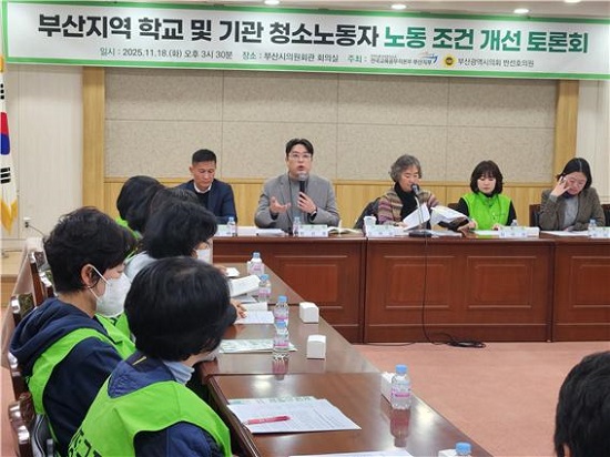 ºÎ»ê½ÃÀÇȸ ´õºÒ¾î¹ÎÁÖ´ç ¼Ò¼Ó ¹Ý¼±È£ ÀÇ¿ø(ºñ·Ê´ëÇ¥)ÀÌ °ø°ø¿î¼ö³ëÁ¶ Àü±¹±³À°°ø¹«Á÷º»ºÎ ºÎ»êÁöºÎ¿Í °øµ¿À¸·Î ¡®ºÎ»êÁö¿ª Çб³ ¹× ±â°ü û¼Ò³ëµ¿ÀÚ ³ëµ¿Á¶°Ç °³¼± Åä·Ðȸ¡¯¸¦ °³ÃÖÇß´Ù.
