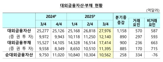 Çѱ¹ÀºÇàÀÌ 19ÀÏ ¹ßÇ¥ÇÑ ¡®2025³â 3ºÐ±â ±¹Á¦ÅõÀÚ´ëÁ¶Ç¥(ÀáÁ¤)¡¯¿¡ µû¸£¸é ´ë¿Ü±ÝÀ¶ÀÚ»êÀº ÀüºÐ±âº¸´Ù 1158¾ï ´Þ·¯ Áõ°¡ÇÑ 2Á¶7976¾ï ´Þ·¯·Î ³ªÅ¸³µ´Ù.