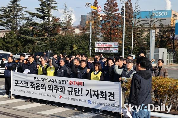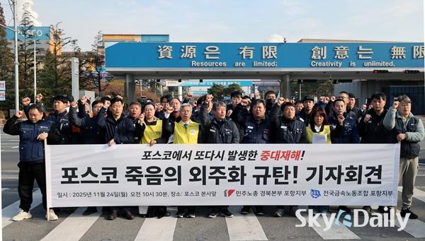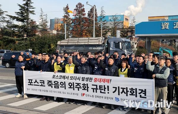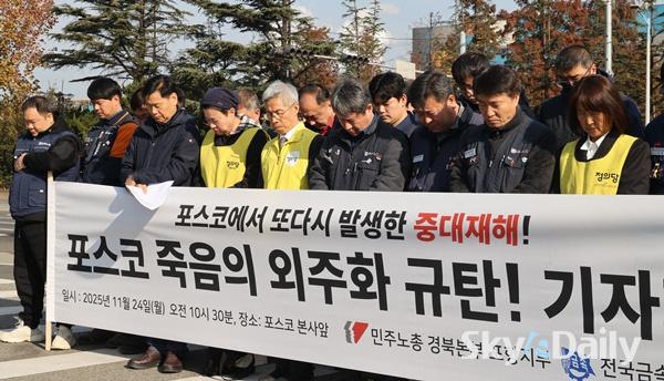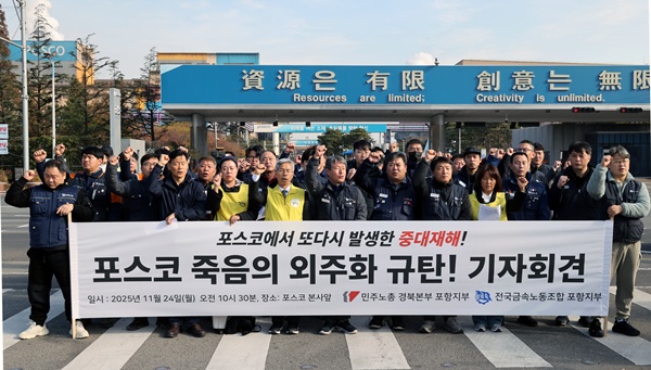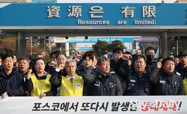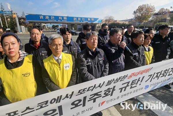 ¡ã ¹ÎÁÖ³ëÃÑ Æ÷Ç×ÁöºÎ¿Í Àü±¹±Ý¼Ó³ëµ¿Á¶ÇÕ Æ÷Ç×ÁöºÎ°¡ 24ÀÏ Æ÷Ç׽à Æ÷½ºÄÚ º»»ç ¾Õ¿¡¼ ±âÀÚȸ°ßÀ» Çϰí ÀÖ´Ù. Âü¼®ÀÚµé STS4Á¦° Áú½Ä Áß´ëÀçÇØ¿Í °ü·Ã ¡®Æ÷½ºÄÚÀÇ ¹Ýº¹µÇ´Â Áß´ëÀçÇØ¿Í Á×À½ÀÇ ¿ÜÁÖÈ ±¸Á¶¸¦ ±ÔźÇÏ´Â ¼º¸í¡¯À» ¹ßÇ¥Çϸç Àç¹ß¹æÁö¿Í Ã¥ÀÓÀÚ Ã³¹úÀ» ¿ä±¸Çß´Ù. Æ÷½ºÄÚ Æ÷Ç×Á¦Ã¶¼Ò´Â Áö³ 20ÀÏ STS 4Á¦°°øÀå ¾ß¿Ü¿¡¼ ½½·¯Áö(Â±â) û¼ÒÀÛ¾÷À» ÇÏ´ø ¿ë¿ª¾÷ü Á÷¿ø°ú Æ÷½ºÄÚ Á÷¿ø µî 6¸íÀÌ °¡½º¸¦ ÈíÀÔÇÏ´Â »ç°í°¡ ³µ´Ù. Æ÷Ç×=ÀÌÁ¾¿ø ±âÀÚ ¨Ï½ºÄ«À̵¥Àϸ®