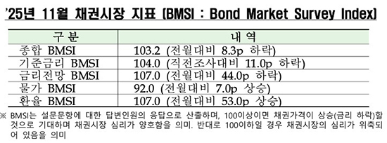 ±ÝÀ¶ÅõÀÚÇùȸ°¡ 25ÀÏ ¹ßÇ¥ÇÑ ¡®2025³â 12¿ù ä±Ç½ÃÀåÁöÇ¥¡¯¿¡ µû¸£¸é, ¿ÃÇØ 11¿ù 14ÀϺÎÅÍ 19ÀϱîÁö ä±Ç º¸À¯¡¤¿î¿ë °ü·Ã Á¾»çÀÚ 100¸í(47°³ ±â°ü)À» ´ë»óÀ¸·Î ½Ç½ÃÇÑ ¼³¹®Á¶»ç¿¡¼ ±âÁرݸ® Àü¸Á ü°¨ÁöÇ¥(BMSI)´Â 104.0À» ±â·ÏÇß´Ù. BMSI ÁöÇ¥°¡ 100À» ¿ôµ¹¸é ±Ý¸® ÀÎÇϸ¦ ¿¹»óÇÏ´Â ºñÁßÀÌ ´õ ³ô´Ù´Â Àǹ̴Ù. ƯÈ÷ À̹ø Á¶»ç¿¡¼´Â µ¿°á ÀÀ´äÀÌ 96%¿¡ ´ÞÇß´Ù.