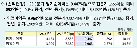 ±ÝÀ¶°¨µ¶¿øÀÌ 1ÀÏ ¹ßÇ¥ÇÑ ¡®2025³â 3ºÐ±â ÀÚ»ê¿î¿ëȸ»ç ¿µ¾÷½ÇÀû(ÀáÁ¤)¡¯¿¡ µû¸£¸é 3ºÐ±â Àüü ÀÚ»ê¿î¿ë»çÀÇ ´ç±â¼øÀÌÀÍÀº 9447¾ï ¿øÀ¸·Î Áý°èµÆ´Ù. 2ºÐ±â(8558¾ï ¿ø)º¸´Ù 892¾ï ¿ø(10.4%) ´Ã¾ú°í, ÀÛ³â 3ºÐ±â(4134¾ï ¿ø)¿¡ ºñÇØ¼´Â 5323¾ï ¿ø(128.5%) Áõ°¡Çß´Ù. °°Àº ±â°£ ¿µ¾÷ÀÌÀÍÀº 7389¾ï ¿ø¿¡¼ 9963¾ï ¿øÀ¸·Î 34.8% ´Ã¾ú°í, ROEµµ 20.6%¿¡¼ 21.9%·Î »ó½ÂÇß´Ù. ¿î¿ë¾÷°è Àü¹ÝÀÇ ¼öÀͼºÀÌ ÇÑ ´Ü°è ¿Ã¶ó¼¹´Ù´Â Àǹ̴Ù.
