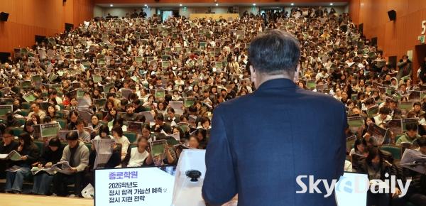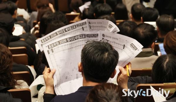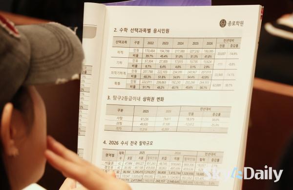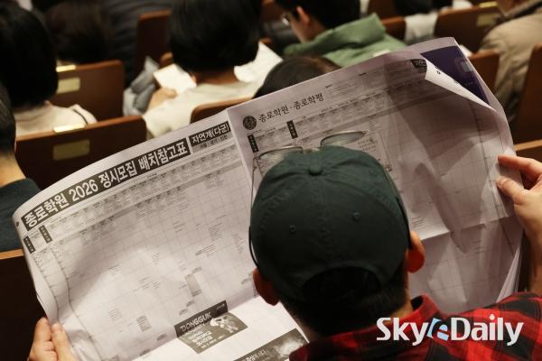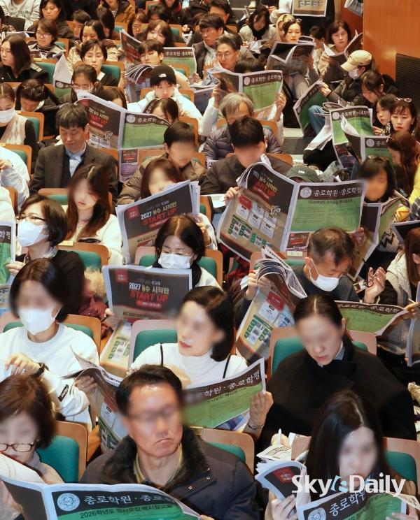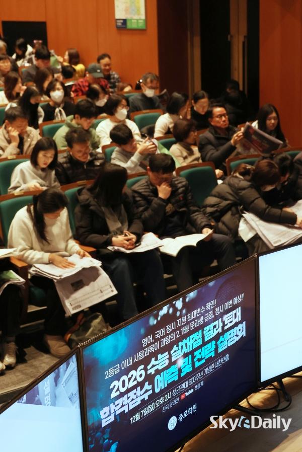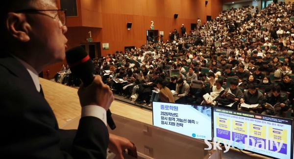 ¡ã Á¾·ÎÇпøÀÌ 7ÀÏ ¼º±Õ°ü´ë 600Áֳ⠱â³ä°ü¿¡¼ '2026 Á¤½Ã ÇÕ°Ý °¡´É¼º ¿¹Ãø ¹× Áö¿øÀü·« ¼³¸íȸ'¸¦ ¿Â¿ÀÇÁ¶óÀÎÀ¸·Î °³ÃÖÇϰí ÀÖ´Â °¡¿îµ¥ Çкθð¿Í ¼öÇè»ýµé 'Á¤½Ã¸ðÁý ¹èÄ¡Âü°íÇ¥¸¦ º¸°í ÀÖ´Ù. À̹ø 2026Çг⵵ ´ëÇмöÇдɷ½ÃÇè(¼ö´É) ½ÇäÁ¡ °á°ú ±¹¾î¿Í ¿µ¾î ¿µ¿ªÀÌ ¿¹³âº¸´Ù ¾î·Æ°Ô ÃâÁ¦µÈ °ÍÀ¸·Î ³ªÅ¸³ª¸é¼ Á¤½Ã Áö¿øÀ» µÑ·¯½Ñ Àü·« °æÀïµµ ÇÑÃþ Ä¡¿ÇØÁú Àü¸ÁÀÌ´Ù. 2026Çг⵵ Á¤½Ã´Â ÀÌ´Þ 29ÀϺÎÅÍ 31ÀϱîÁö ¿ø¼Á¢¼ö¸¦ ÁøÇàÇÑ´Ù. ¹Ú¹Ì³ª ±âÀÚ ¨Ï½ºÄ«À̵¥Àϸ®