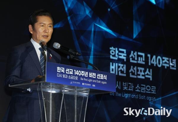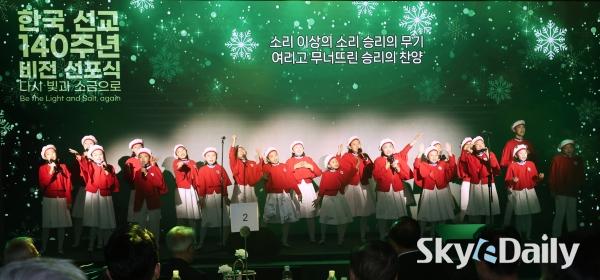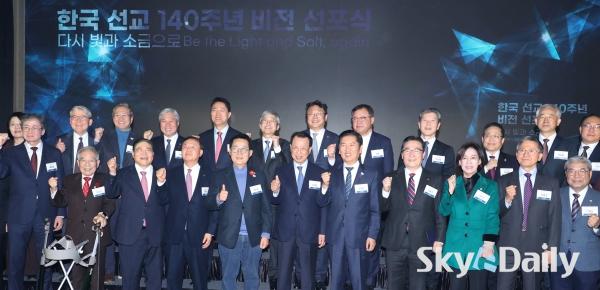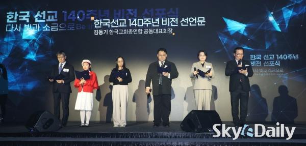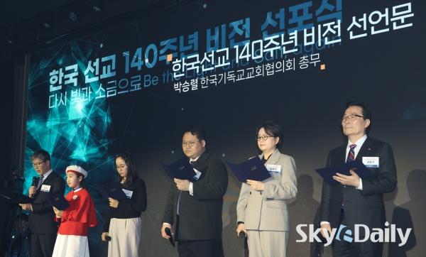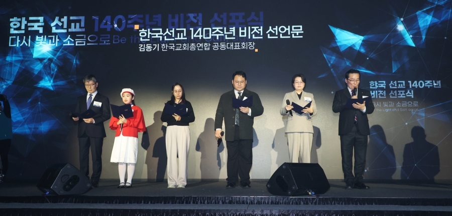 ¡ã Çѱ¹±âµ¶±³±³È¸ÇùÀÇȸ(NCCK)¿Í Çѱ¹±³È¸ÃÑ¿¬ÇÕ(Çѱ³ÃÑ)ÀÌ 15ÀÏ °øµ¿À¸·Î ¡®Çѱ¹ ¼±±³ 140Áֳ⠺ñÀü ¼±Æ÷½Ä: ´Ù½Ã ºû°ú ¼Ò±ÝÀ¸·Î¡¯¸¦ ¿©Àǵµ Æä¾î¸óÆ® ¾Ú¹è¼­´õ ¼­¿ï ±×·£µåº¼·ë¿¡¼­ °³ÃÖÇϰí ÀÖ´Â °¡¿îµ¥ Âü¼®ÀÚ ´ëÇ¥µéÀÌ ¹«´ë¿¡¼­ ºñÀü ¼±¾ð¹®À» ³¶µ¶¡¤¼±Æ÷Çϰí ÀÖ´Ù. ¿ÃÇØ´Â ¾ð´õ¿ìµå¿Í ¾ÆÆæÁ©·¯ ¼±±³»ç°¡ Çѱ¹¿¡¼­ ¼±±³¸¦ ½ÃÀÛÇØ º¹À½ÀÇ ¾¾¾ÑÀ» ½ÉÀº Áö 140ÁÖ³âÀÌ µÇ´Â ÇØ·Î½á Çѱ¹±³È¸°¡ Ãʱ⠼±±³»çµéÀÇ ¼þ°íÇÑ Á¤½ÅÀ» °è½ÂÇϰí, ½Ã´ëÀû °¥µîÀ» ³Ñ¾î ¿¬ÇÕ°ú È­ÇÕÀ¸·Î ³ª¾Æ°¡±â À§ÇÑ »õ ºñÀüÀ» ¼±Æ÷ÇÏ·Á°í ¸¶·ÃÇÑ ÀÚ¸®´Ù. ¹Ú¹Ì³ª ±âÀÚ ¨Ï½ºÄ«À̵¥Àϸ®