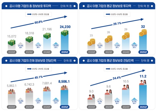 °úÇбâ¼úÁ¤º¸Åë½ÅºÎ´Â 30ÀÏ ¡®2025³â ±â¾÷ Á¤º¸º¸È£ ÅõÀÚ¡¤Àη °ø½Ã ÇöȲ ºÐ¼® º¸°í¼¡¯¿¡¼ Á¤º¸º¸È£ °ø½Ã ±â¾÷ÀÇ ÃÑ ÅõÀÚ¾×ÀÌ 2Á¶4,230¾ï¿øÀ¸·Î Àü³â ´ëºñ 14.3% Áõ°¡Çß´Ù°í ¹àÇû´Ù. Á¤º¸º¸È£ Àü´ãÀηÂÀº 8,506¸íÀ¸·Î 10.7% ´Ã¾ú´Ù.