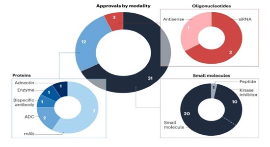 ¹ÙÀÌ¿À½Å¾àÀº ´ÜÀÏŬ·ÐÇ×ü(mAb) 7°³, Ç×ü¾à¹°Á¢ÇÕü(ADC) 2°³, ÀÌÁ߯¯ÀÌÇ×ü(Bi-specific), È¿¼Ò, ¾Æµå³ØÆ¾ °¢°¢ 1°³ µî ÃÑ 12°³°¡ ½ÂÀι޾ҴÙ. Ç×ü¿Í À¯»çÇÑ Ä¡·á È¿´ÉÀ» °¡Áö¸é¼µµ Å©±â°¡ ÀÛÀº ¾Æµå³ØÆ¾(Adnectin) ±â¹Ý ¹ÙÀÌ¿À½Å¾àÀÌ ÃÖÃÊ Çã°¡µÆ´Ù.
