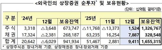 ä±ÇÀº ¿Ü±¹ÀÎ ÀÚ±Ý À¯ÀÔÀÌ ´õ ¶Ñ·ÇÇß´Ù. ¿Ü±¹ÀÎÀº 12¿ù »óÀåä±ÇÀ» 17Á¶5270¾ï ¿ø ¼ø¸Å¼öÇßÁö¸¸ ¸¸±â»óȯ µîÀ¸·Î 9Á¶6400¾ï ¿øÀÌ ºüÁ®³ª°¡¸é¼­, °á°úÀûÀ¸·Î 7Á¶8870¾ï ¿øÀ» ¼øÅõÀÚÇß´Ù. ¿Ü±¹ÀÎÀÇ »óÀåä±Ç º¸À¯¾×Àº 328Á¶5000¾ï ¿øÀ¸·Î Àü¿ù ´ëºñ 6Á¶9000¾ï ¿ø Áõ°¡Çß°í, »óÀåÀÜ¾× ´ëºñ º¸À¯ºñÁßÀº 11.9% ¼öÁØÀ¸·Î Áý°èµÆ´Ù.