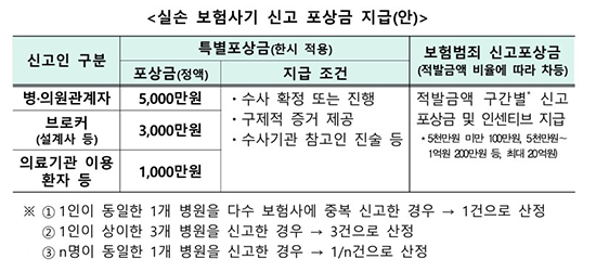 Æ÷»ó ±Ô¸ð´Â Á¦º¸ÀÚÀÇ ½ÅºÐ¿¡ ¸ÂÃç Â÷µî Àû¿ëÇÑ´Ù. º´¡¤ÀÇ¿ø °ü°èÀÚ(ÀÇ»ç, °£È£»ç, »ó´ã½ÇÀå µî)°¡ ½Å°íÇÑ °æ¿ì ÃÖ´ë 5000¸¸¿ø, ȯÀÚ À¯ÀΡ¤¾Ë¼± ºê·ÎÄ¿(¼³°è»ç µî)°¡ ½Å°íÇÑ °æ¿ì ÃÖ´ë 3000¸¸¿ø, ÀÇ·á±â°ü ÀÌ¿ë ȯÀÚ µîÀÌ ½Å°íÇÑ °æ¿ì ÃÖ´ë 1000¸¸¿øÀÇ Æ¯º°Æ÷»ó±ÝÀÌ Áö±ÞµÈ´Ù. ´Ù¸¸ ´Ü¼ø Á¦º¸¸¸À¸·Î´Â Áö±ÞµÇÁö ¾Ê´Â´Ù. ³ìÃë·Ï µî ±¸Ã¼Àû ¹°ÁõÀ» Á¦½ÃÇØ ¼ö»ç·Î À̾îÁö°í Âü°íÀÎ Áø¼ú µî ¼ö»ç¿¡ Àû±Ø ÇùÁ¶ÇÏ´Â °æ¿ì¿¡ ÇÑÇØ Æ÷»ó±ÝÀ» Áö±ÞÇÑ´Ù. Ưº°Æ÷»ó±Ý ¿Ü¿¡µµ »ý¡¤¼Õº¸Çùȸ°¡ ¿î¿µ ÁßÀÎ ±âÁ¸ ¡®º¸Çè¹üÁË ½Å°íÆ÷»ó±Ý¡¯ÀÌ Ãß°¡·Î Áö±ÞµÅ Á¦º¸ À¯ÀÎÀ» ´õÇÑ´Ù.