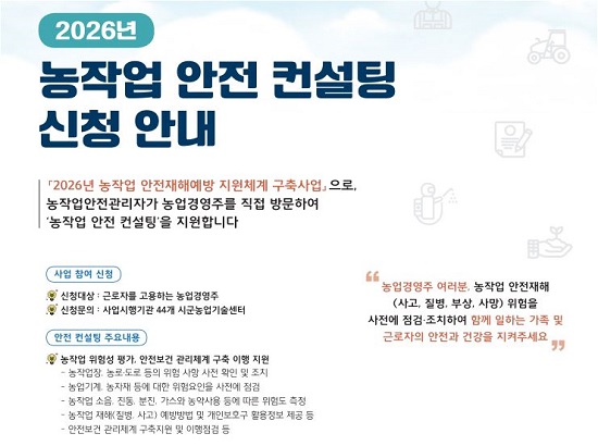 °æ»óºÏµµ ±¸¹Ì½Ã°¡ ¡®2026³â ³óÀÛ¾÷ ¾ÈÀüÀçÇØ ¿¹¹æ Áö¿øÃ¼°è ±¸Ãà»ç¾÷¡¯ÀÇ ÀÏȯÀ¸·Î ±Ù·ÎÀÚ¸¦ °í¿ëÇÏ´Â ³ó¾÷°æ¿µÁÖ¸¦ ´ë»óÀ¸·Î ¡®³óÀÛ¾÷ ¾ÈÀü ÄÁ¼³ÆÃ¡¯ Âü¿© ³ó°¡¸¦ ¸ðÁýÇÑ´Ù.