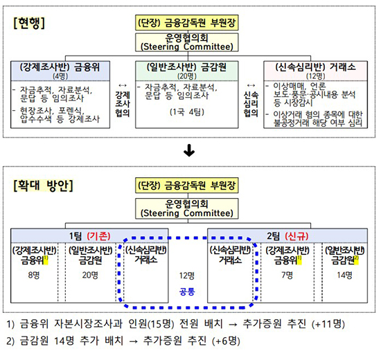Á¶Á÷Àº ±âÁ¸ ¡®3¹Ý 1ÆÀ¡¯¿¡¼­ ¡®2ÆÀ üÁ¦¡¯·Î Ä¿Áø´Ù. ±ÝÀ¶À§´Â ÀÚº»½ÃÀåÁ¶»ç°ú ÀηÂÀ» 1ÆÀ °­Á¦Á¶»ç¿¡ ¿ì¼± ¹èÄ¡Çϰí, 2ÆÀ °­Á¦Á¶»ç¿¡´Â Á÷Á¦ Áõ¿øÀ¸·Î È®º¸ÇÑ ÀηÂÀ» ½Å¼ÓÈ÷ ÅõÀÔÇÑ´Ù.
