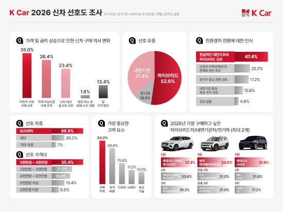 ±¹³» ÃÖ´ë Á÷¿µÁß°íÂ÷ Ç÷§Æû ±â¾÷ ÄÉÀÌÄ«(K car)´Â 15ÀÏ Àü±¹ ¼ºÀÎ ³²³à 500¸íÀ» ´ë»óÀ¸·Î 2026³â Ãâ½Ã ¿¹Á¤ ½ÅÂ÷ ¼±È£µµ¿Í ÀÚµ¿Â÷ ±¸¸ÅÀνÄÀ» Á¶»çÇÑ °á°ú¸¦ °ø°³Çß´Ù. °¡°Ý ºÎ´ãÀÌ Ä¿ ½ÅÂ÷ ±¸¸Å¸¦ ¸Á¼³À̰í ÀÖ´Ù¿Í ½ÅÂ÷ ´ë½Å Áß°íÂ÷¸¦ Àû±Ø °í·ÁÇϰí ÀÖ´Ù´Â ´äº¯ÀÌ °¢°¢ 26.4%¿Í 23.4%·Î Áý°èµÅ Àý¹Ý °¡·®(49.8%)ÀÌ ½ÅÂ÷ ±¸¸Å¸¦ ÁÖÀúÇϰí ÀÖ´Â °ÍÀ¸·Î º¼ ¼ö ÀÖ´Ù.