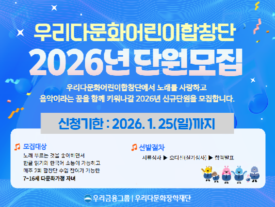 ¿ì¸®±ÝÀ¶±×·ì ¿ì¸®´Ù¹®ÈÀåÇÐÀç´ÜÀº ¡®¿ì¸®´Ù¹®È¾î¸°ÀÌÇÕâ´Ü¡¯ÀÇ 2026³âµµ ½Å±Ô ´Ü¿øÀ» ¸ðÁýÇÑ´Ù°í 15ÀÏ ¹àÇû´Ù. 7¼¼ºÎÅÍ 16¼¼±îÁöÀÇ ´Ù¹®È°¡Á¤ ÀÚ³à¶ó¸é 25ÀϱîÁö Àç´Ü ȨÆäÀÌÁö¸¦ ÅëÇØ Áö¿øÇÒ ¼ö ÀÖ´Ù.