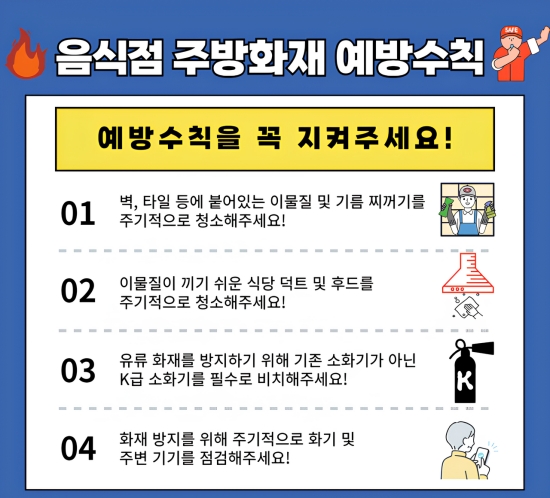 °Ü¿ïö À½½ÄÁ¡ ÈÀ縦 ¿¹¹æÇϱâ À§ÇØ ¡âÁÖ¹æ ³» °¡½º·¹ÀÎÁö ÁÖº¯¿¡ ¼Òȱâ¿Í K±Þ ¼Òȱ⸦ ºñÄ¡ ¡âµ¿½Ä¹° ±â¸§À» Á¦°ÅÇÒ ¼ö ÀÖ´Â ÇÊÅÍ µî ¼³Ä¡ ¡âÀÚµ¿È®»ê¼ÒÈÀåÄ¡ ¹× °¡½ºÂ÷´Ü±â¸¦ ¼³Ä¡ ¡â³ëÈÄµÈ Àü¼± ±³Ã¼ µî ¾ÈÀü¼öÄ¢À» ÁؼöÇØ¾ß ÇÑ´Ù.