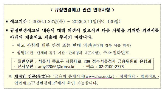 ÀºÇà¾÷°¨µ¶±ÔÁ¤ °³Á¤¾È ±ÔÁ¤º¯°æ¿¹°í¿Í °ü·ÃÇØ ÀǰßÀÌ ÀÖ´Â °æ¿ì, Âù¼º ¶Ç´Â ¹Ý´ë ¿©ºÎ¸¦ ¸í½ÃÇÑ Àǰ߼¸¦ Á¦ÃâÇÏ¸é µÈ´Ù. ¹Ý´ë ÀǰßÀ» ³¾ ¶§´Â »çÀ¯µµ ÇÔ²² Àû¾î¾ß ÇÑ´Ù. Àǰ߼¿¡´Â Á¦ÃâÀÚÀÇ ¼º¸í(±â°ü¡¤´Üü´Â ±â°ü¡¤´Üü¸í°ú ´ëÇ¥ÀÚ¸í), ÁÖ¼Ò, ÀüȹøÈ£¸¦ ±âÀçÇØ¾ß ÇÑ´Ù.