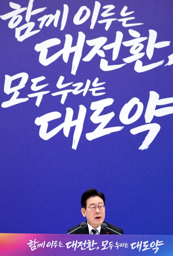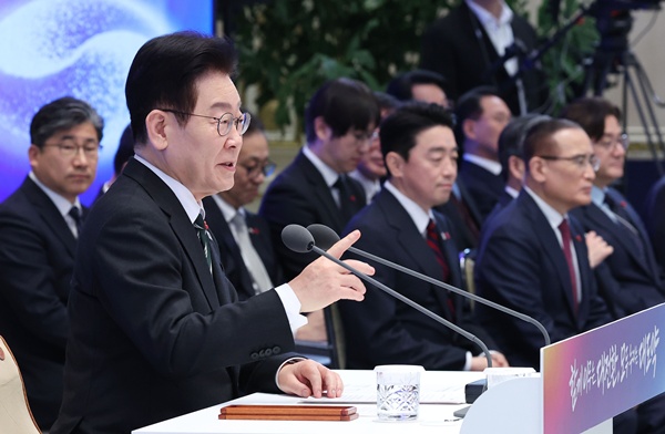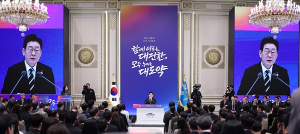¡ã ÀÌÀç¸í ´ëÅë·ÉÀÌ 21ÀÏ Ã»¿Í´ë ¿µºó°ü¿¡¼­ ¿­¸° ½Å³â ±âÀÚȸ°ß¿¡¼­ ÃëÀçÁøÀÇ Áú¹®À» ¹Þ°í ÀÖ´Ù. À̹ø ȸ°ßÀº Áý¹«½ÇÀ» û¿Í´ë·Î ÀÌÀüÇÑ µÚ óÀ½ ¿­¸° °ø½Ä ±âÀÚȸ°ßÀ¸·Î, ¡®ÇÔ²² ÀÌ·ç´Â ´ëÀüȯ, ¸ðµÎ ´©¸®´Â ´ëµµ¾à¡¯À» ÁÖÁ¦·Î ÀÌ ´ëÅë·ÉÀÇ ¸ðµÎ¹ß¾ð°ú ±âÀÚ ÁúÀÇÀÀ´ä Çü½ÄÀ¸·Î ÁøÇàµÆ´Ù. ¿¬ÇÕ´º½º