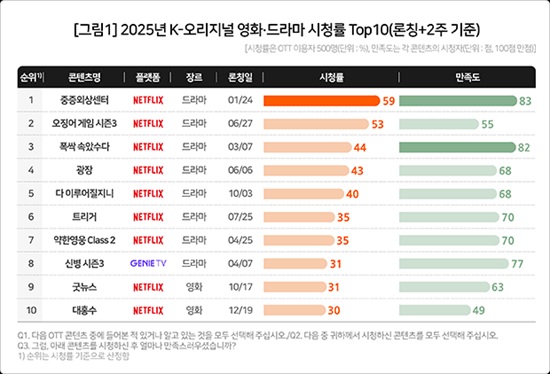 2025³â K-¿À¸®Áö³Î ¿µÈ­¡¤µå¶ó¸¶ ½Ãû·ü Åé10Àº ³ÝÇø¯½ºÀÇ µ¶¹«´ë¿´´Ù. 1À§´Â ¡®ÁßÁõ¿Ü»ó¼¾ÅÍ(59%)¡¯°¡ Â÷ÁöÇß°í 2À§´Â ¡®¿À¡¾î °ÔÀÓ ½ÃÁð3(53%)¡¯¿´´Ù. 3À§ ¶ÇÇÑ ¡®Æø½Ï ¼Ó¾Ò¼ö´Ù(44%)¡¯°¡ Â÷ÁöÇÏ´Â µî »óÀ§ 10°³ Áß 9°³¸¦ ³ÝÇø¯½º ÄÜÅÙÃ÷°¡ ÈÛ¾µ¾ú´Ù.