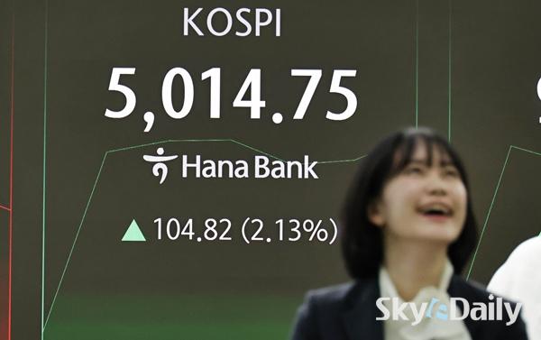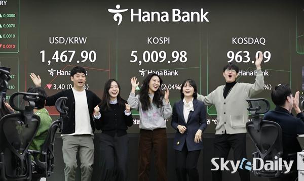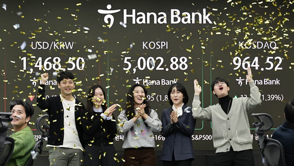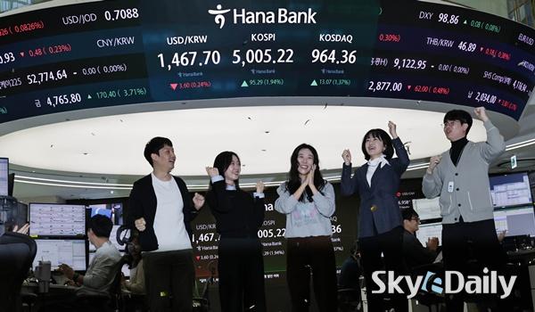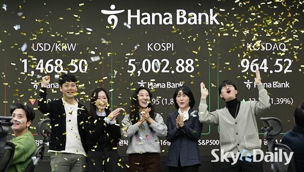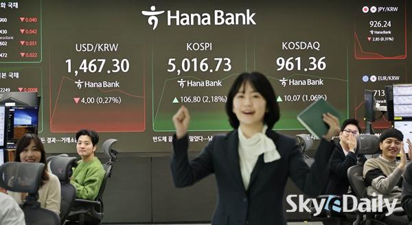 ¡ã 22ÀÏ ¿ÀÀü ÄÚ½ºÇǰ¡ 5000À» µ¹ÆÄÇÏÀÚ ¼¿ï Áß±¸ ÇϳªÀºÇົÁ¡ µô¸µ·ë¿¡¼ Á÷¿øµéÀÌ È¯È£Çϰí ÀÖ´Ù. Çѱ¹ Áõ½Ã°¡ »ç»ó óÀ½À¸·Î ¡®ÄÚ½ºÇÇ 5000 ½Ã´ë¡¯¸¦ ³ÑÀº°ÍÀº 1989³â 1000Æ÷ÀÎÆ®¸¦ µ¹ÆÄÇÑ Áö 37³â, 2021³â 3000Æ÷ÀÎÆ®¸¦ ³Ñ¾î¼± Áö 5³â ¸¸¿¡ ´Þ¼ºÇÑ Äè°Å´Ù. À̳¯ Çѱ¹°Å·¡¼Ò¿¡ µû¸£¸é ÄÚ½ºÇÇ´Â À̳¯ Àü °Å·¡ÀÏ ´ëºñ 1.57%(77.13Æ÷ÀÎÆ®) ¿À¸¥ 4987.06À¸·Î Ãâ¹ßÇß´Ù. °³Àå Á÷ÈÄ »ó½Â ÆøÀ» ´õ Ű¿ì¸ç 5000¼±À» ¿ôµ¹¾Ò°í ÀåÁß ÇѶ§ 5019.54±îÁö Ä¡¼Ú±âµµ Çß´Ù. ÀÌÁ¾¿ø ±âÀÚ ¨Ï½ºÄ«À̵¥Àϸ®