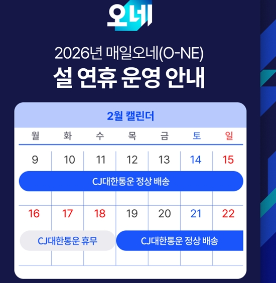 CJ´ëÇÑÅë¿îÀº ¸ÅÀÏ¿À³×(O-NE) ¼ºñ½º¸¦ ±â¹ÝÀ¸·Î ´ÙÀ½´Þ 15ÀÏ ÀÏ¿äÀϱîÁö ¼³ ¼±¹°À» Æ÷ÇÔÇÑ ÅÃ¹è »óǰÀ» Á¤»ó ¹è¼ÛÇÑ´Ù. ´Ù¸¸ ¿øÈ°ÇÑ ¿î¿µ°ú ¹è¼ÛǰÁú À¯Áö¸¦ À§ÇØ Á¦ÁÖµµ ¹× ÀϺΠµµ¼ Áö¿ªÀº 2¿ù 12ÀϱîÁö Áýȸ¦ ¸¶°¨ÇÑ´Ù. ¼³ ´çÀÏÀ» Æ÷ÇÔÇØ ¿¬ÈÞ 3ÀÏ(2¿ù 16~18ÀÏ)Àº ȸ»ç Â÷¿øÀÇ ÈÞ¹«ÀÏ·Î ÁöÁ¤ÇØ º¸ÆíÀû È޽ıÇÀ» º¸ÀåÇϸç, 19ÀϺÎÅÍ ´Ù½Ã Á¤»ó ¿î¿µ¿¡ µé¾î°£´Ù.